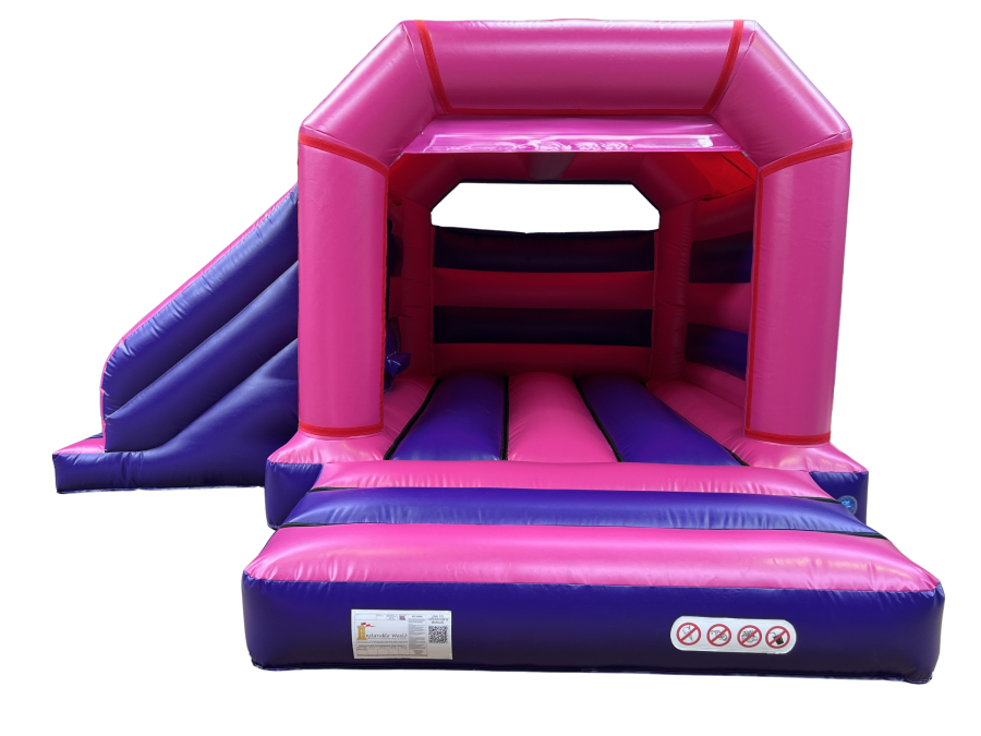 The A-Frame 15 x 11 Side Slide from Inflatable World combines robust construction with smart hire-focused features. Built from UK-made PVC and supplied as part of our Beetwo range, this model accepts Beetee Velcro artworks for fast, eye-catching branding swaps. It comes with a 2 year warranty and a PIPA tag as standard—everything a professional bouncy castle hire company needs for safe, reliable rental inventory.