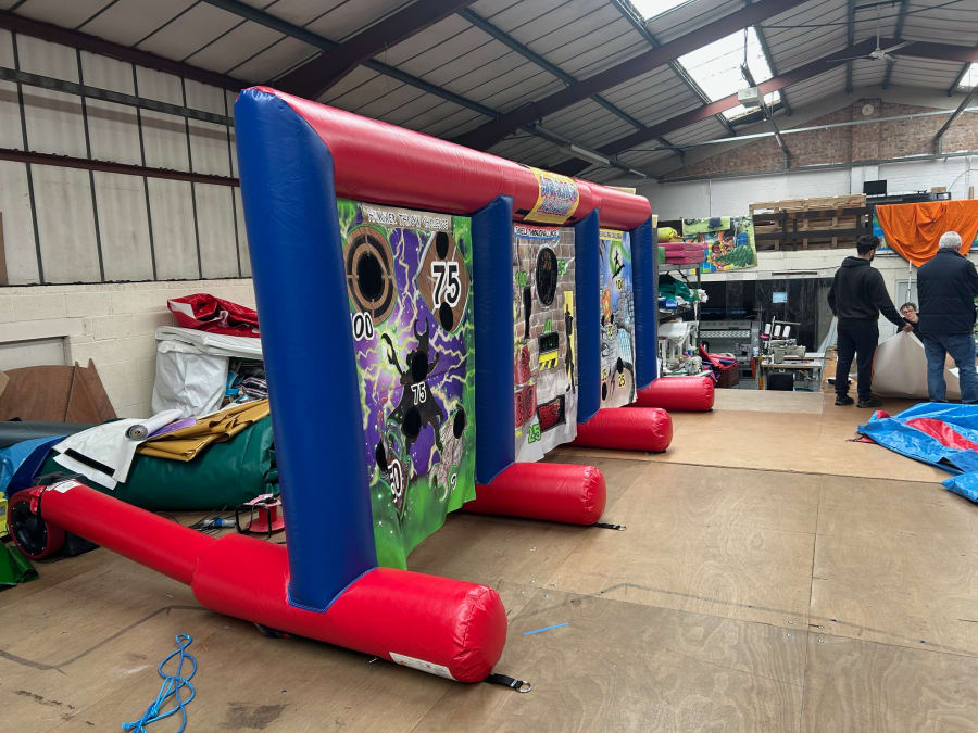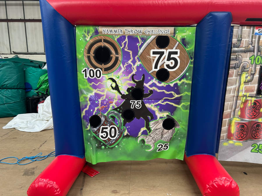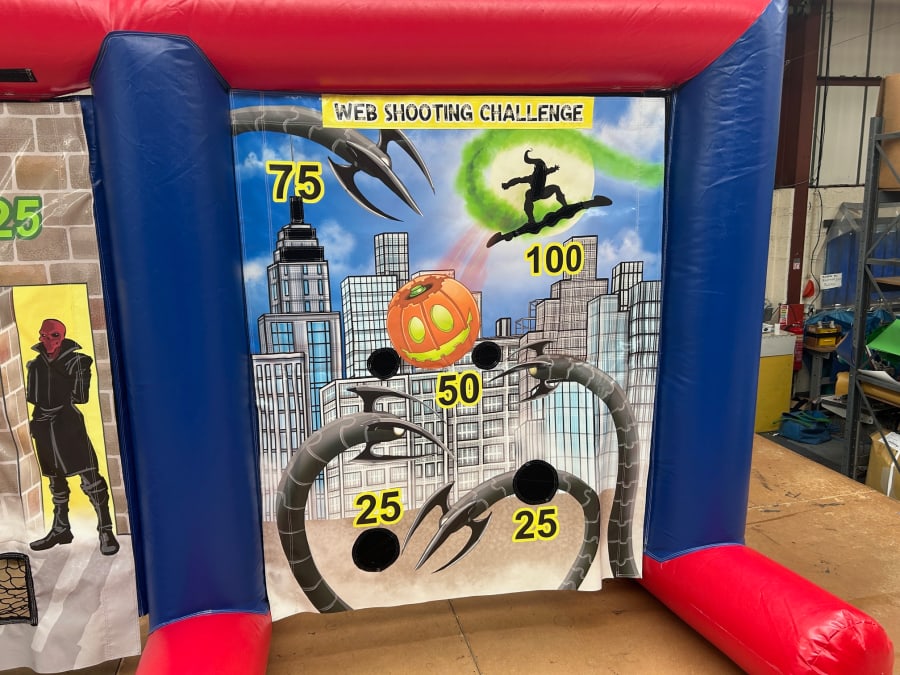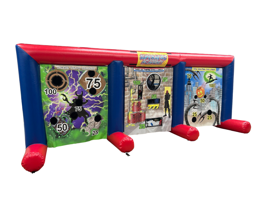 Introduce the Superhero Academy, a thrilling 3-in-1 inflatable game designed by Inflatable World in Nottingham. This eye-catching unit combines hammer throwing, shield tossing and webslinging for nonstop action. Ideal for bouncy castle companies and event hire businesses looking to boost bookings and revenue.